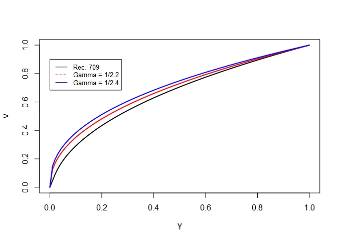 The chart below shows the relationship between the scene-linear value and the non-linear encoding for the actual Rec709 opto-electrical transfer function, and the encodings using simple gamma functions. As you can see the encodings are not interchangable. I don't mean to be a stickler, but if you have LUTs encoded with a simple gamma OETF and Adobe implemented Rec709 properly, your LUTs would still not appear correctly if you convert them to camera raw presets.