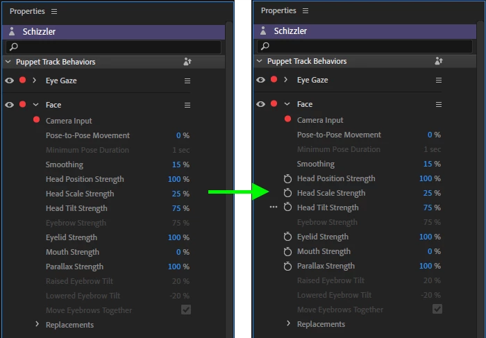 Like in After Effects I think it would be beneficial to see at once which parameters can be animated via keyframes with grey stop watch icons that are visible all the time and not only with mouse over.