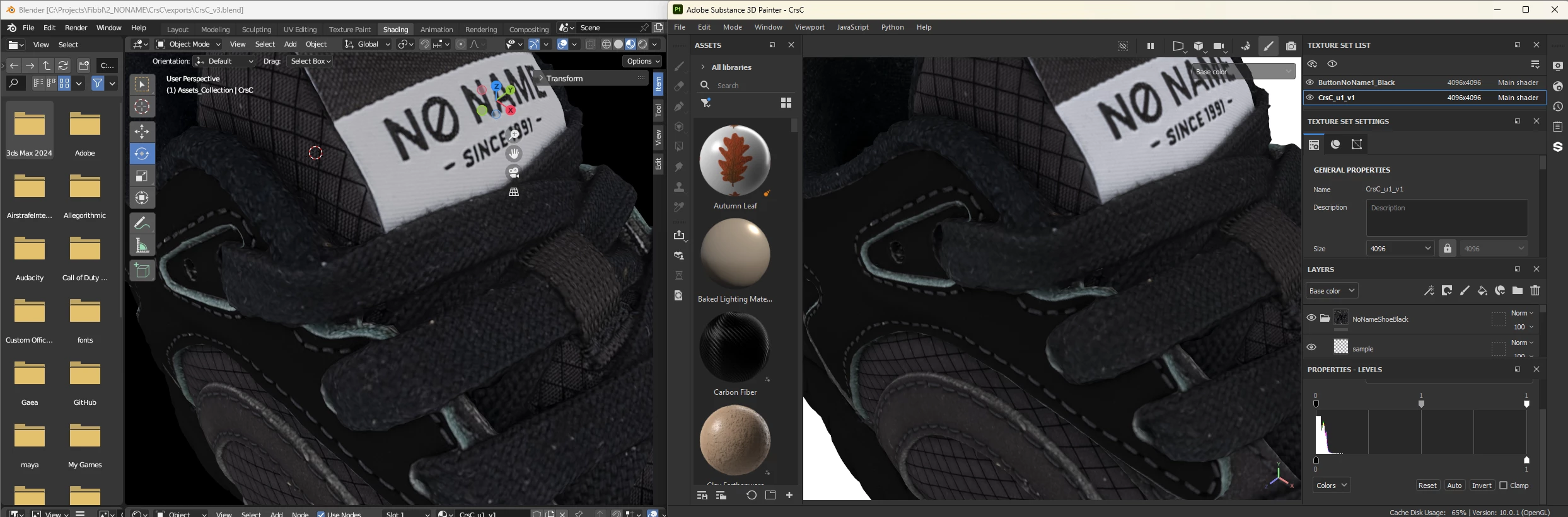 I was wondering if it is possible to get a custom shader that supports 100% rough materials that don't reflect light at all. Currently if the material is 100% rough in painter there is still light that is reflected. At work I use a custom viewer where the darker areas that are fully rough dont reflect light at all. I would love to have a this as a custom shader in substance 3d painter so that I know my model will look the same in both programs. Below I have attached 2 images comparing the shadowed areas inside a shoe. I also noticed that in painter the textures seem to be slightly less saturated? I have attached one more image comparing the base color in blender vs substance 3d painter.