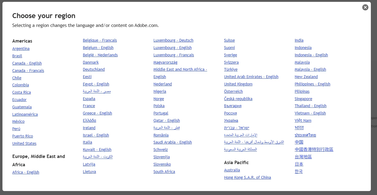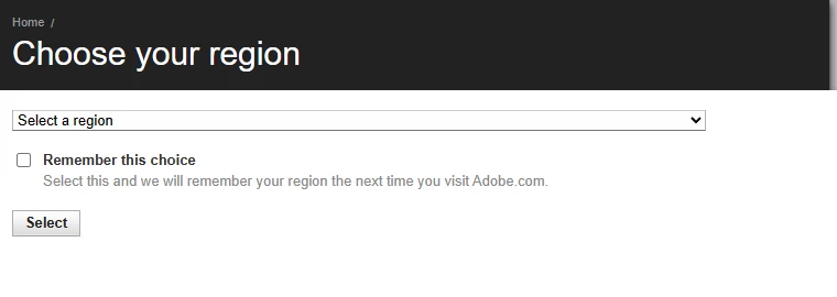 Adobe website needs to display our current website region