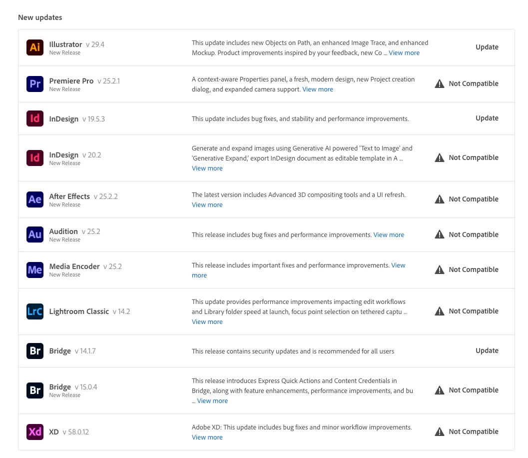 It would awesome if there was a way to "hide incompatible updates." Maybe when a person starts an Adobe account on an old computer you can let them know that they're a pariah on the gods of tech for not trusting Apple then. As for the rest of us, the ones who would not pay $7k for a base rack mount system that was almost comparable to the system we just bought, we don't need to know that Apple doesn't support us.