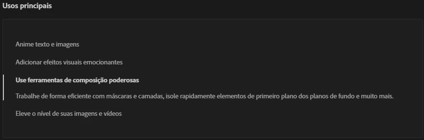 Estava navegando pela UI do Creative Cloud no desktop, quando fui ver a descrição do After Effects, e percebi que na aba de "Usos Principais", os textos e as descrições estão confusas.