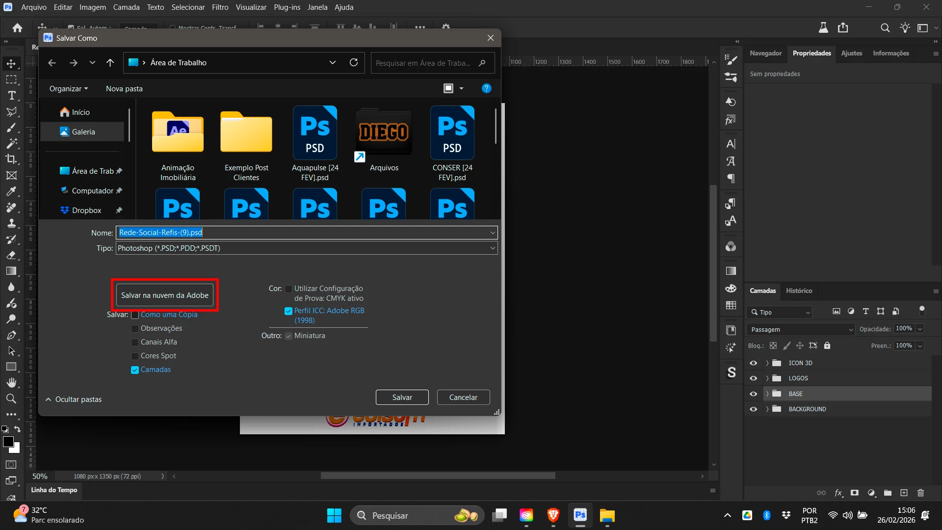 Toda vez que eu tento salvar um documento do photoshop na nuvem da Creative Cloud, a caixa do "Salvar como" abre novamente e a caixa da "nuvem" não abre