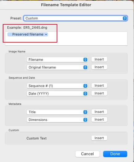 I've always hated that we can't do the same with Pano and HDR files.  A dash and small p or h added to the name would plenty sufficient for me and less confusing to clients getting the files.  Now we have a wonderful new AI noise feature that adds an even more complex name to derivative files with no option to alter it.  You've moved me to finally sit down and write this!