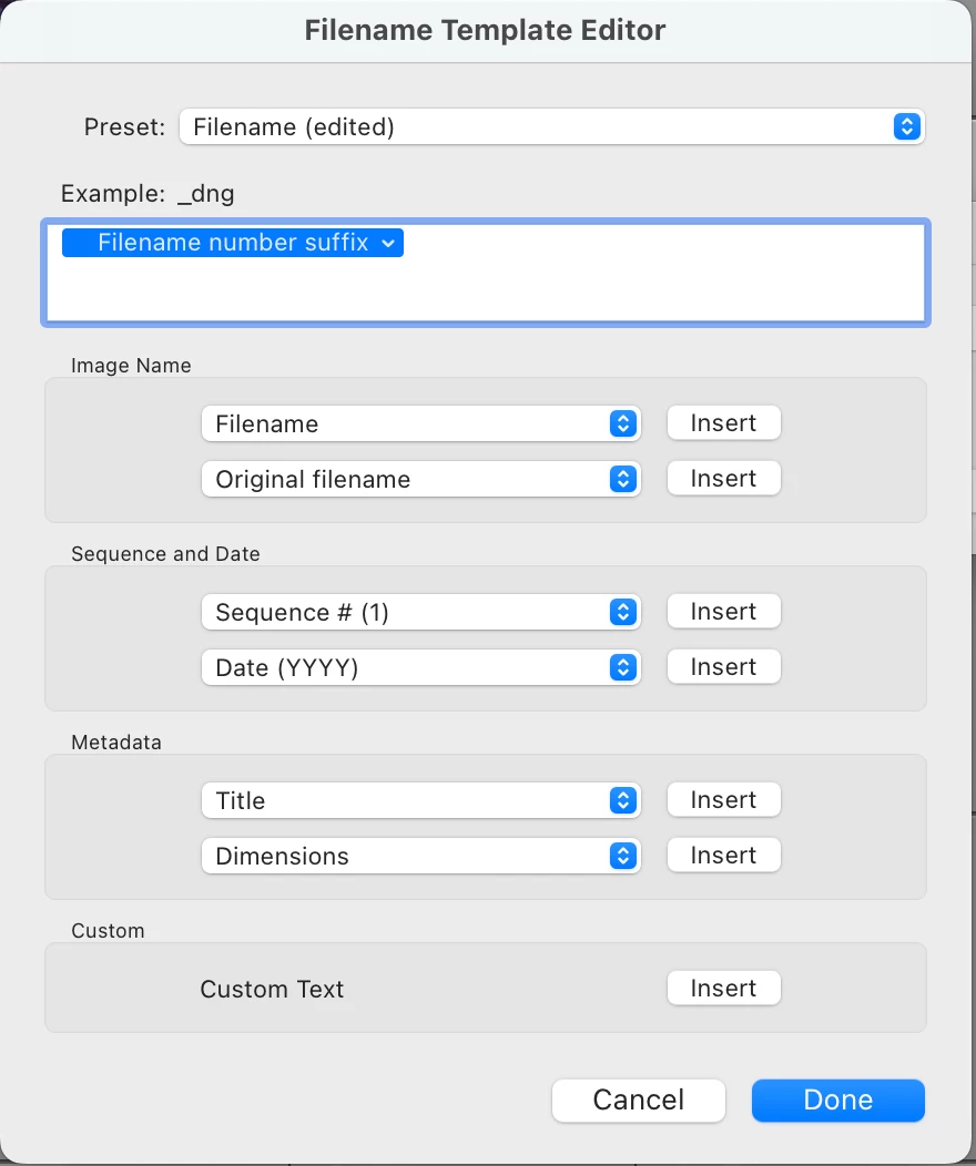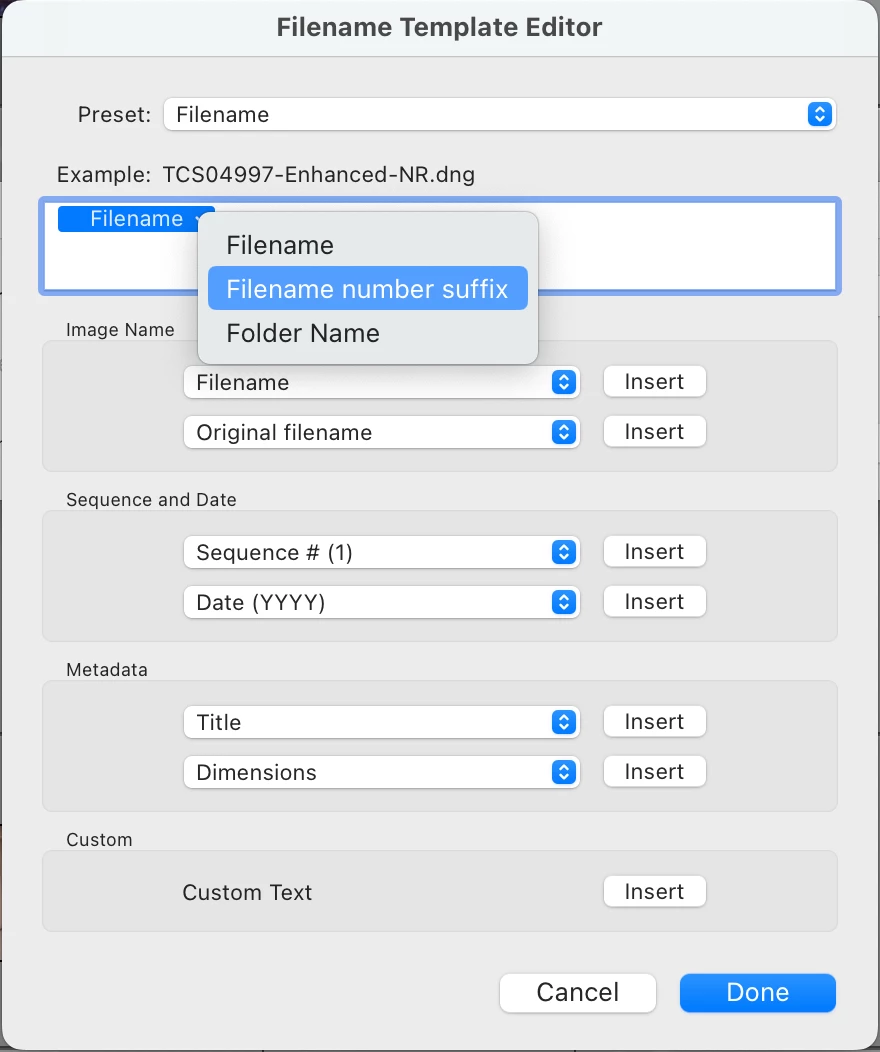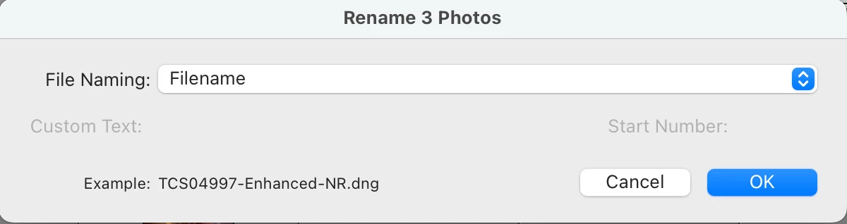 10. Filenaming/Renaming: If I have a batch of images that have been denoised, I batch rename either in Lightroom Classic or in Finder. Both workflows explained earlier in the thread.  I usually will opt to adjust filenames in LRC to keep things consistent. There are situation where you would change the names in Finder (e.g. specific filename nomenclatures for client deliveries)