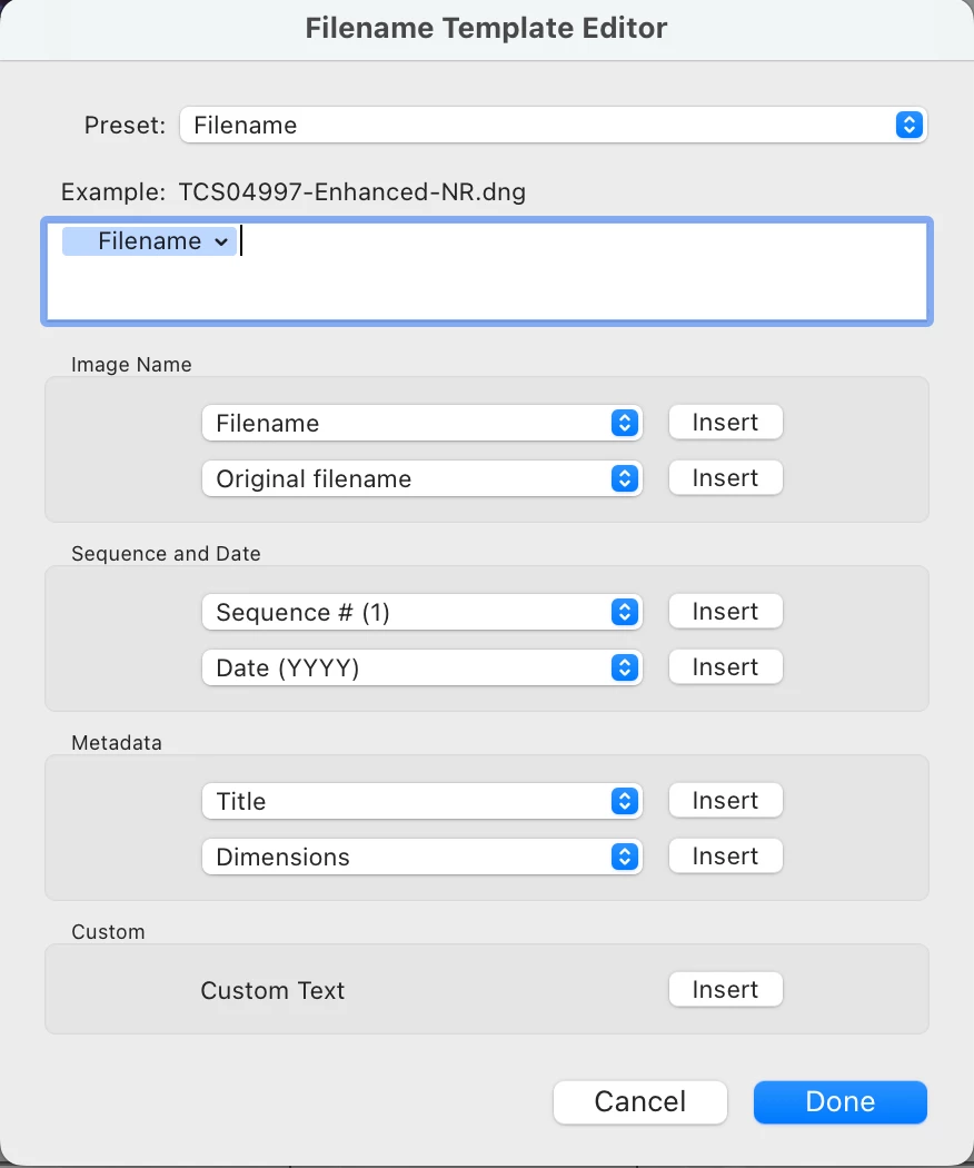 In the edit module choose the PRESET. (In this case we're sticking with the Filename preset)