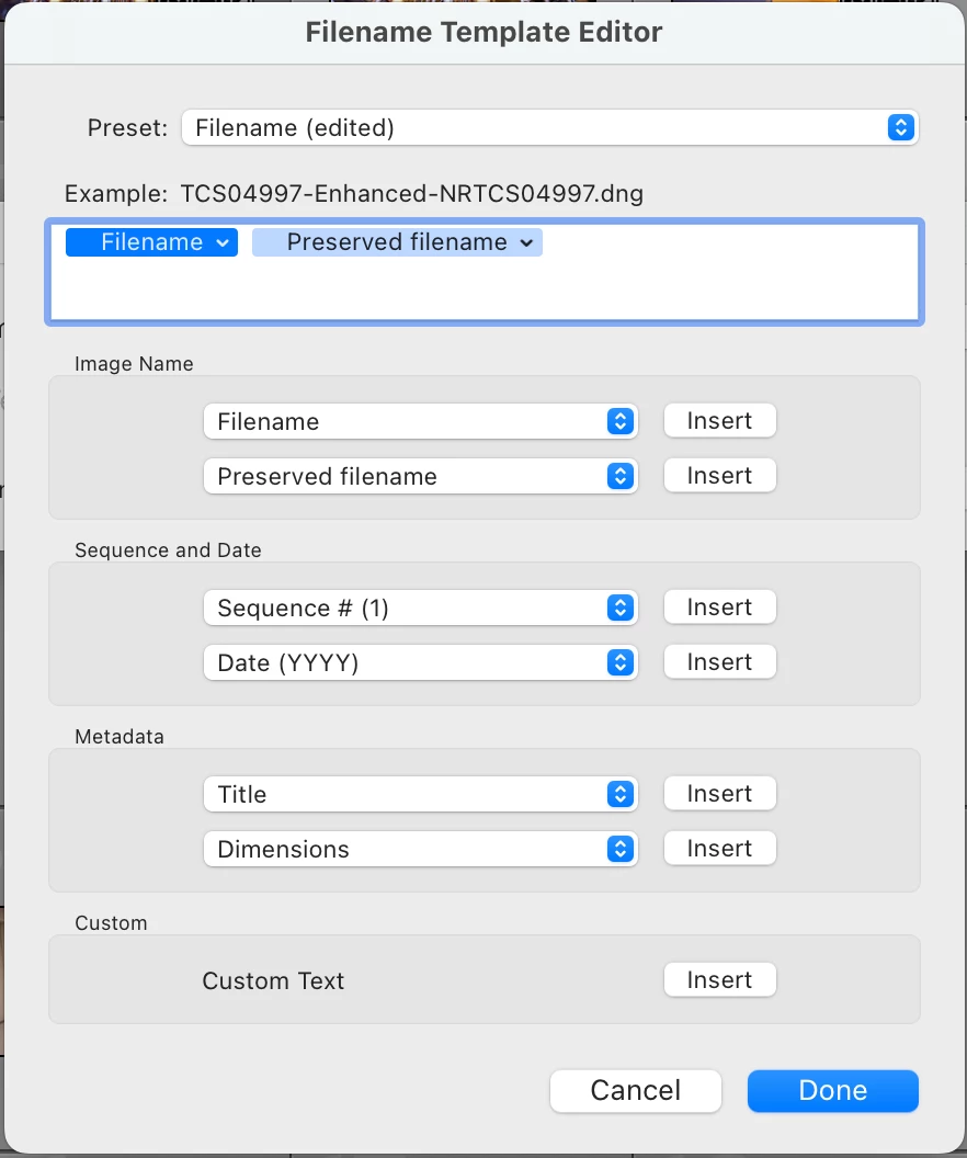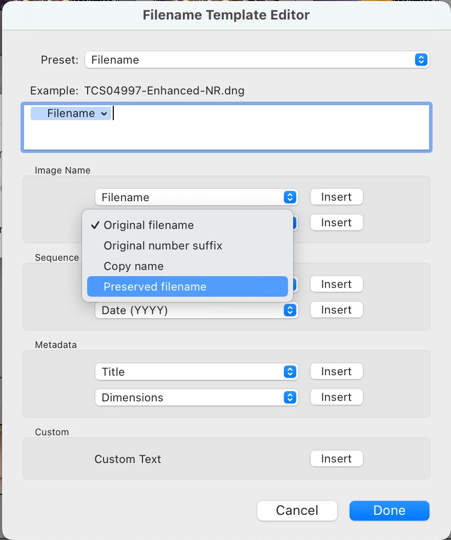 With this way you are preserving the orignal filename. I prefer to sequence them so that way it is clear to me that it is a child of the parent file but either way this does come in handy if you're original is the RAW and you want your "Enhanced" DNGs to have matching nomenclature to its source/parent.