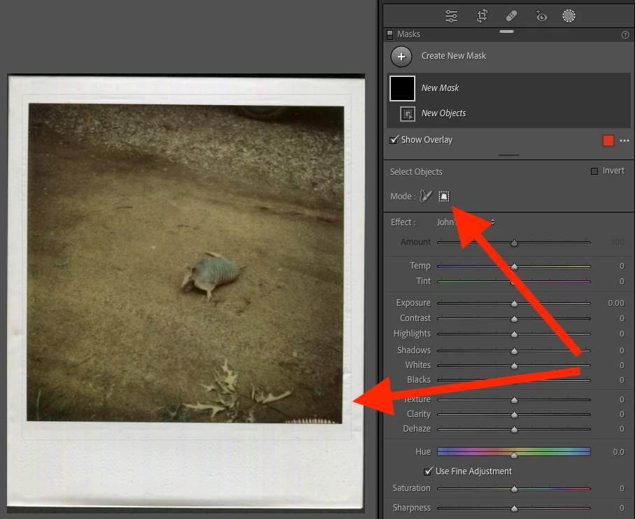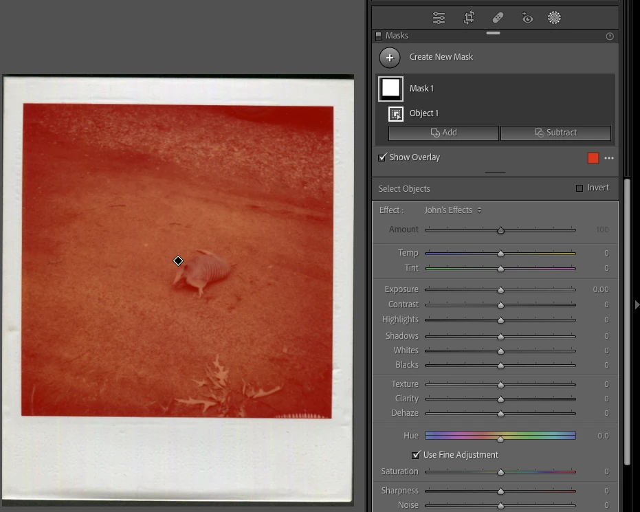 What I'd like to be able to do is have a mask created for me that includes just the image area, so that I can adjust the image separately from the border area. It seems like this is a common enough use case that there could be an "image area" mask option that detects something that looks like an image surrounded by a relatively uniform color border.