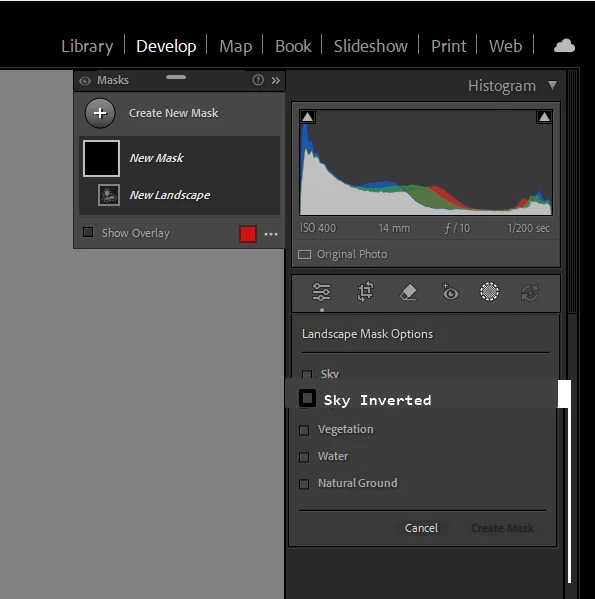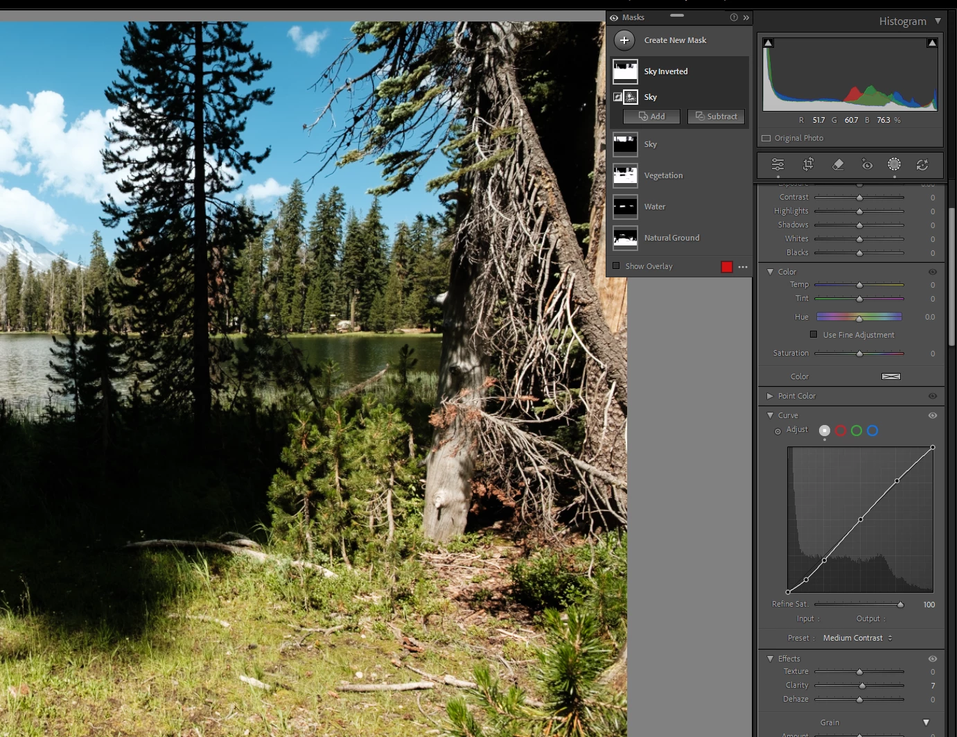 Request for change. In the crete masks/Landscape, add at least one inverse mask, in this case, Invert Sky. This to allow a quick special mask where a user can apply edits such as the curve, Clarity, and several possible contrast edits to everything except the sky.