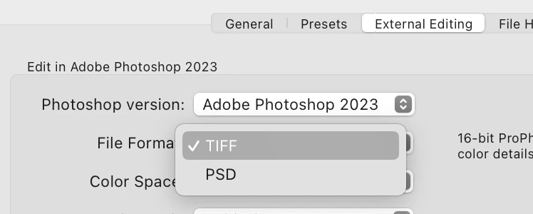 Currently, when selecting "Edit In...Photoshop" from Lightroom Classic there is the option to open the raw image in Photoshop as either a PSD or TIFF. If the edits and layers created in Photoshop result in a file larger than 2 or 4 GB, it must be saved as a PSB (Large Format file). Unfortunately, this requires utilizing the Save As dialog in Photoshop and manually navigating to the folder where the other images in the set are stored, creating potential issues due to human error and costing unnecessary time. Similarly, when opening a previously edited TIFF from Lightroom Classic into Photoshop, and making changes that result in the need for a PSB file, the resulting file does not automatically import into Lightroom, requiring a manual import operation. Apart from compatibility with older software versions, there doesn't seem to be any good reason why images shouldn't be converted immediately to PSB when opening raws from Lightroom, if a user knows they routinely work with large files and expect the edited file size to exceed the lower limits of other formats.