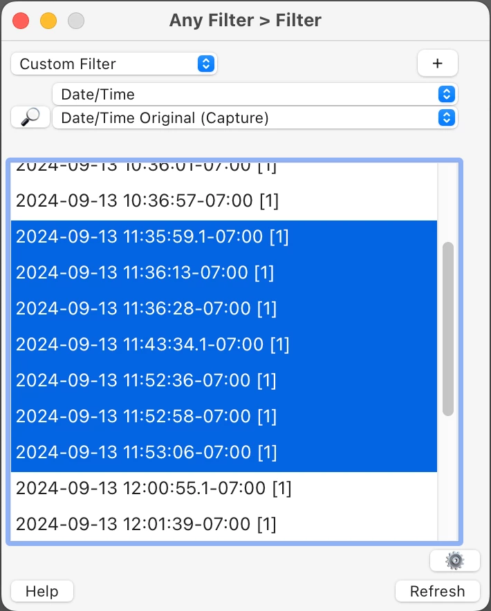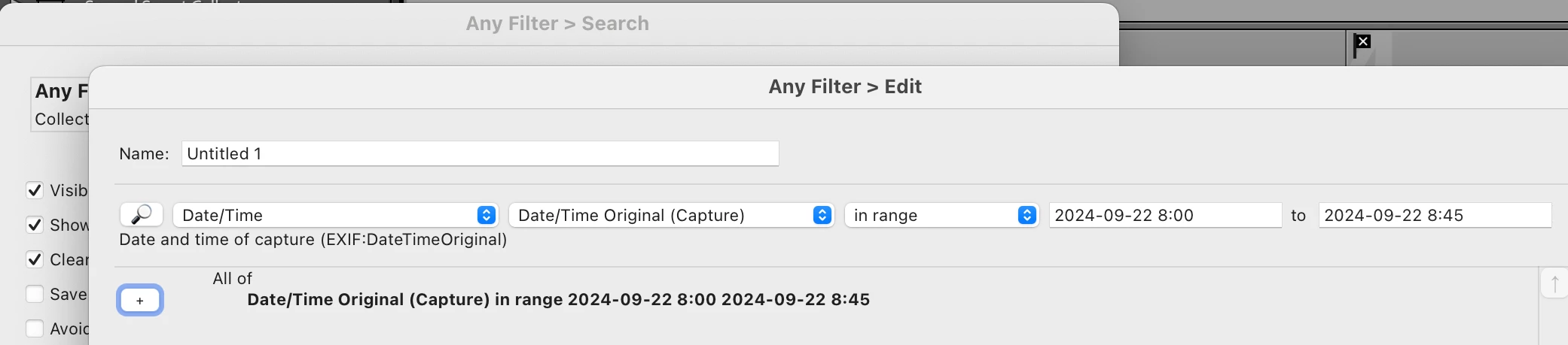 It would be great if the Smart Collection date fields could support time in addition to the date. This would allow us to create filters like "Capture Date" in the range of 2024-09-22 08:00 to 2024-09-22 08:45.