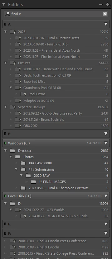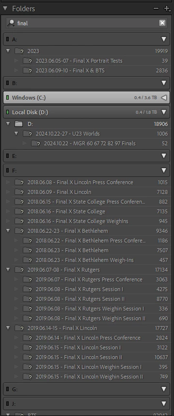 For example, I have a bunch of folder names containing the term "Final X", such as 2018.06.08 - Final X Lincoln and 2023.06.09-10 - Final X & BTS. If I type in final in the Filter Folders search bar, it will filter all of those Final X folders, but it will also include folders like "Final Images" or "Tournament Finals".