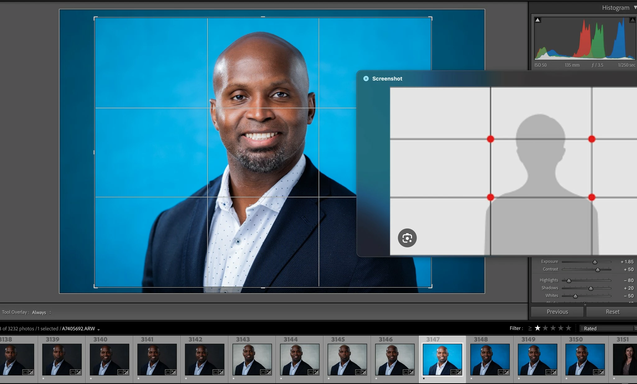 By way of using a simple reference image or outline the program could run automatically making these adjustments subtly while conforming to a predetermined crop.