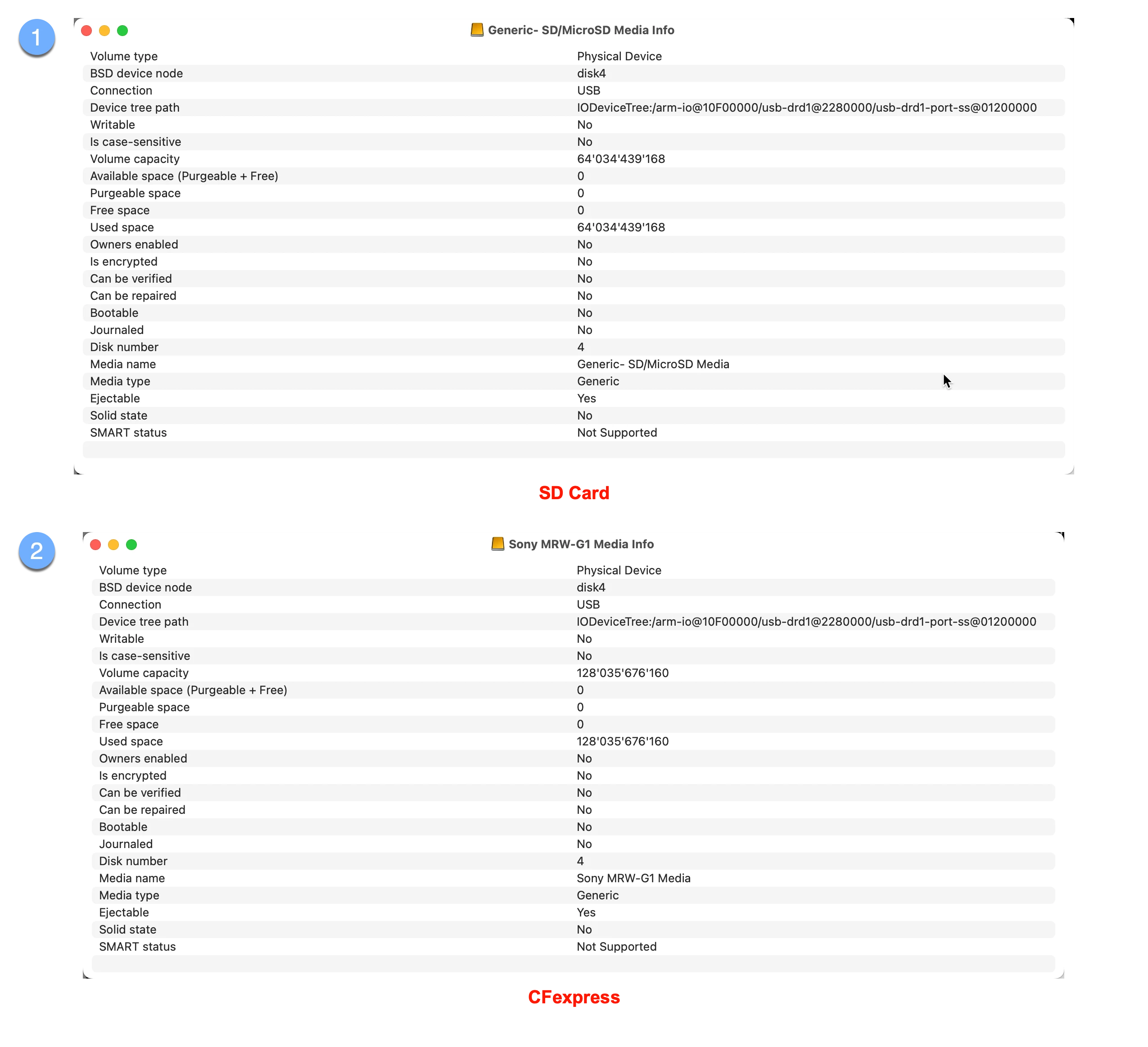 Honestly, there isn't much difference between SD and CFexpress shown by Disk Utility of Monterey 12.4, viewing the info for the Sony MRW-G1 (can read/write XQD and CFexpress Type B) and SATECHI for the SD Card. In the attached screenshot, I checked the info for the devices, not the volume partitions.