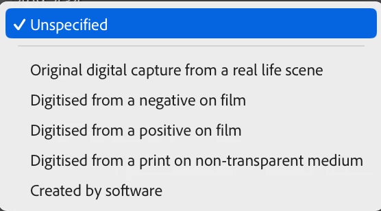 The first value implemented in Lightroom is incorrect. Lightroom uses "Original digital capture from a real life scene", while the correct value is "Original digital capture sampled from real life". The final value implemented in Lightroom, "Created by software", is now deprecated and has been replaced by a variety of more specific values.