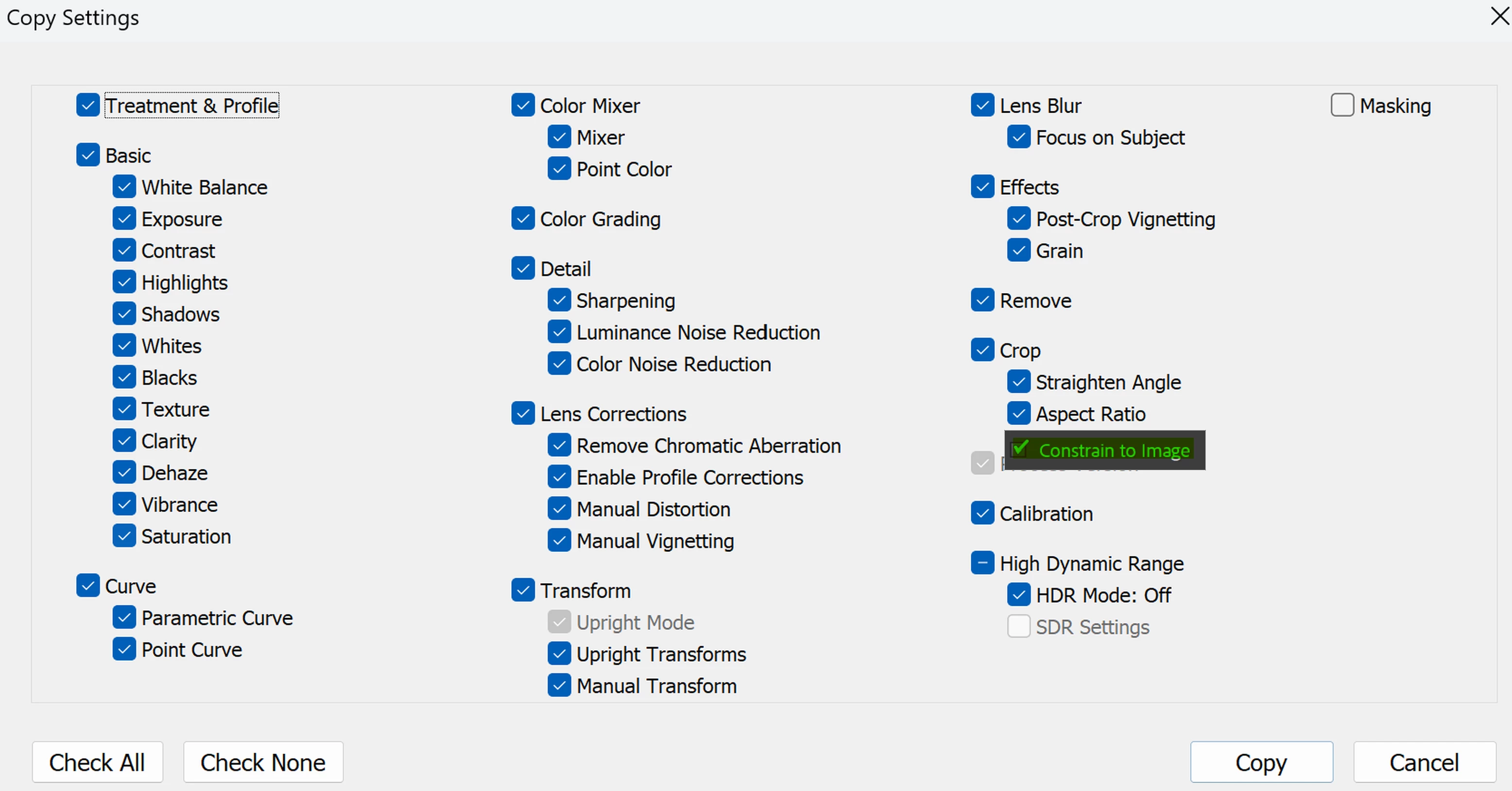 'Copy Settings' dialog box,