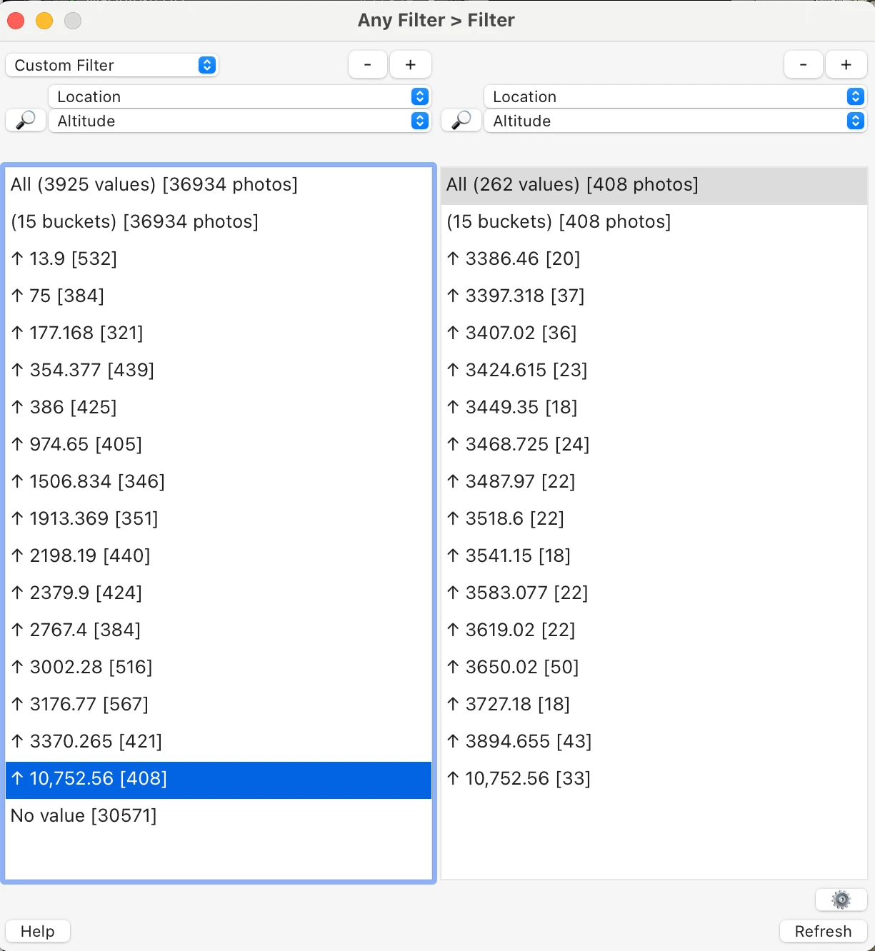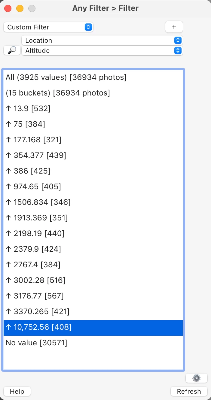 Maybe it wuold be cool to add feature like filter by "altitude range" to group photos i.e. with altitude between 100 to 120m. Pointing the range by suer would avoid ugrouping photos with small altitude differencies such 0,1 - 0,5m