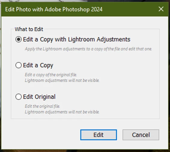 When choosing to 'Edit in Photoshop' this is the dialog: