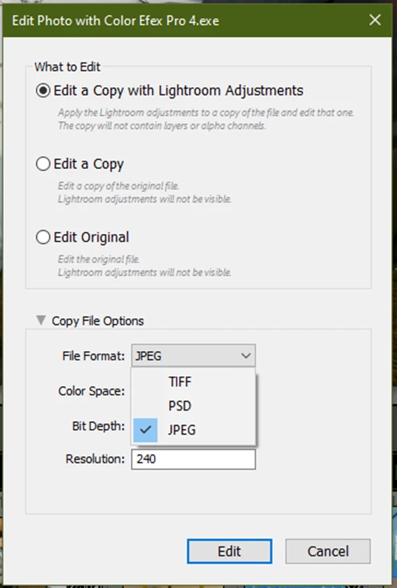 All the others allow you to choose JPEG, the Resolution, and the Color Space. Only Adobe fails to offer those 'Edit in' options.