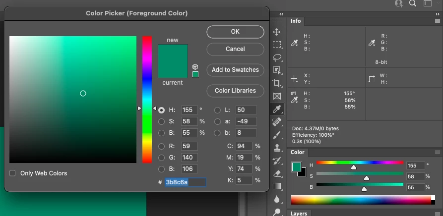 and if you're wondering... here's how i have my workspace set up in Ps to take advantage of HSL(B), with the Info and Color Panels, as well as the Picker. Once you start using HSB, you'll never go back to the confusion that is RGB.