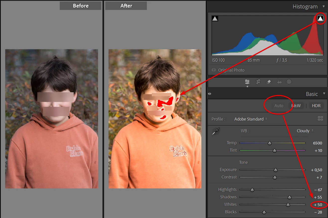 it cranks up whites to +50 resulting in blown out face.... smh