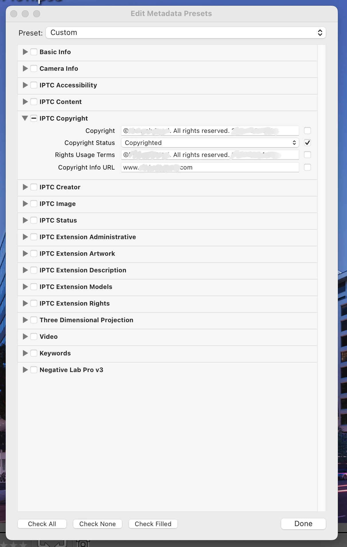 Photo 02 show nice big readable metadata fields in Lr, bravo. HowEVER, if you go into Lr's metadata "edit presets" you get Photo 03, completely useless metadata fields that make me want to jump off a bridge. The "Rights Usage" field only allows one to see ONE LINE at a time. Omg. I have one client who loves to pack info into these field, it used to be so easy and smooth, now its a ridiculously frustrating and amature affair. How does Adobe allow this sort of thing to happen and continue? I hold out no hope that Adobe will care, respond or help. After all, the ridiculosly ineffiecint or non-working things I've reported over the years continue or go without response. One would think that a person using Ps etc for 25+ years would be of some value to them, but no.