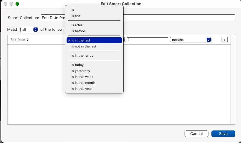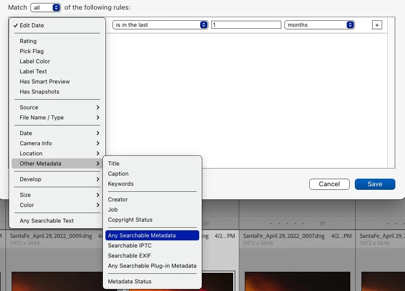 I have been redeveloping some old images, and thus the Metadata Date is updated. I would like to be able to search for all those images for which the metadata date is today but I'm seeing that it is not possible. In fact, being able to choose a range of time over which such a change occurred could helpful. I'd hope that adding such a feature to the metadata find choices would be fairly straightforward. Thanks. Thanks, especially, for such a wonderful program!