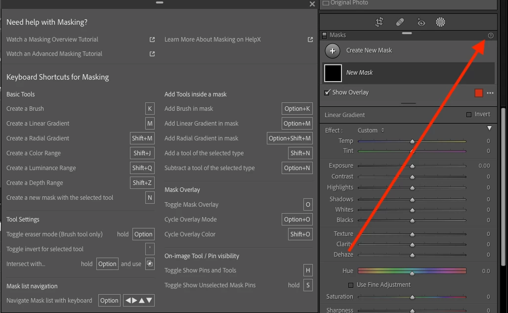 There should be a keyboard shortcut that opens the mask panel with the top most mask already selected. As it stands, Shift+M opens the radial gradient mask window with a new mask. But when I'm copy and pasting settings from image to image, the radial gradient has already been created and pasted to the new photo. So I just need to open to the mask window and preferrably already have the topmost layer selected so I can immediately move the radial gradient around to where the subject is in the new photo. Instead, I have to press option+arrows buttos to navigate to the layer. Even clicking on the Mask tool button doesn't open the panel with a layer preselected. Why not have a shortcut just to open it with the top most layer already selected? It will save clicks when making small adjustments to masks that are being copy and pasted from one photo to the other.