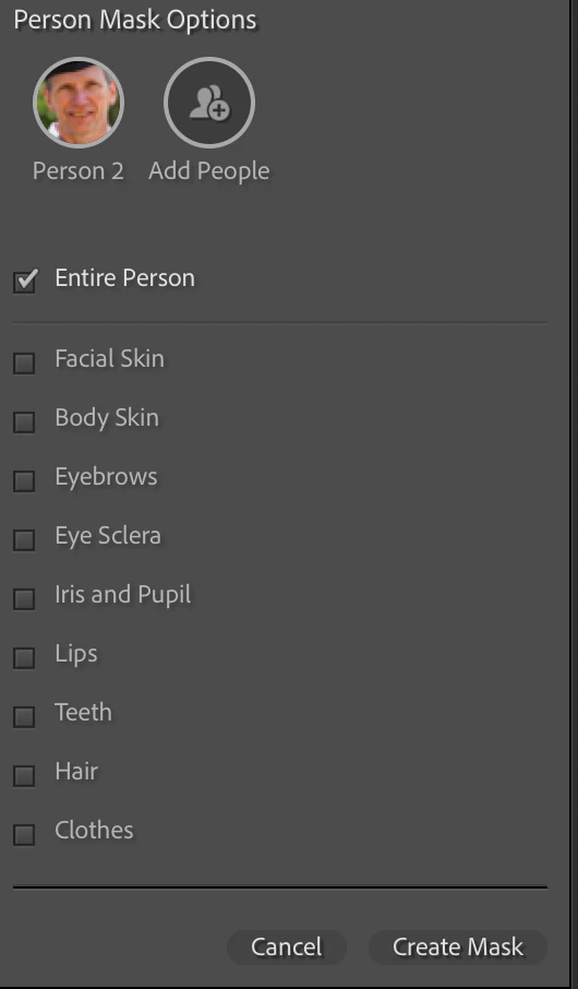 Selecting people is very good but sometimes i don't want to select clothing but i do every aspect of the 'head' and this can mean selecting 8 boxes which is very time consuming when working on dozens of images. There is only an option for Entire Person or to individually select all the options.