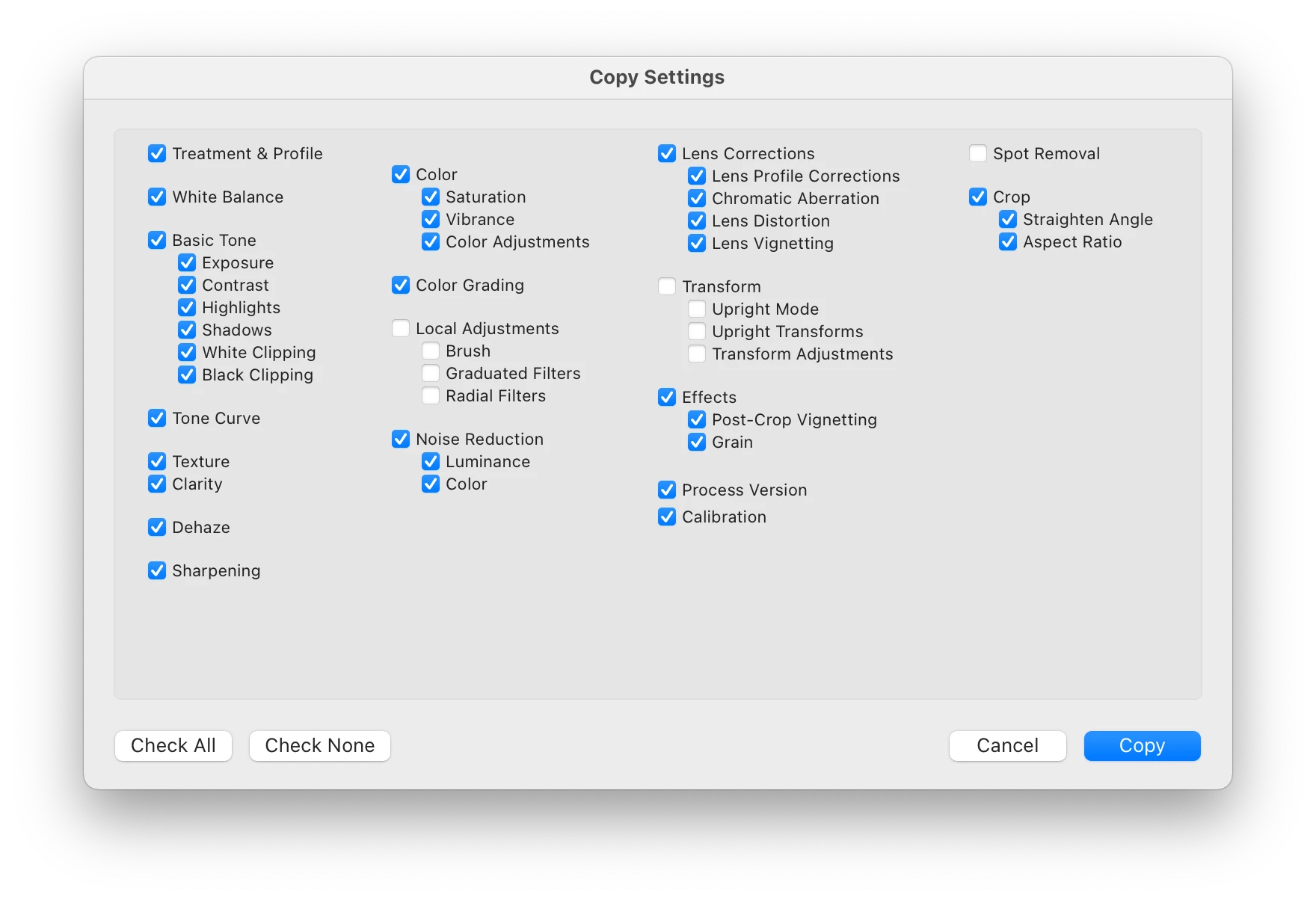 i.e. The user can specify exactly which Devlop options they wish to include in their user presets. e.g. sync/copy with crop,sync/copy without crop,sync/copy with Transform,sync/copy without transform, sync/copy with crop and lens corrections, sync/copy with local adjustments/brush, sync without local adjustments/brush, or sync with dehaze and texture and clarity, sync with lens profile corrections…etc. etc.