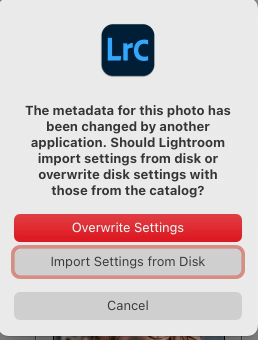 I wish there was a way to set Lightroom to always import settings, as I can’t remember ever wanting to lose work I did in the raw window, and I am afraid I will accidentally hit Enter, or click the top choice, losing all the work I will have done to potentially hundreds of files. I wish there was a way to never see this dialog box, and ALWAYS Overwrite setting (similar to how I can select Don’t show again in other dialog box).