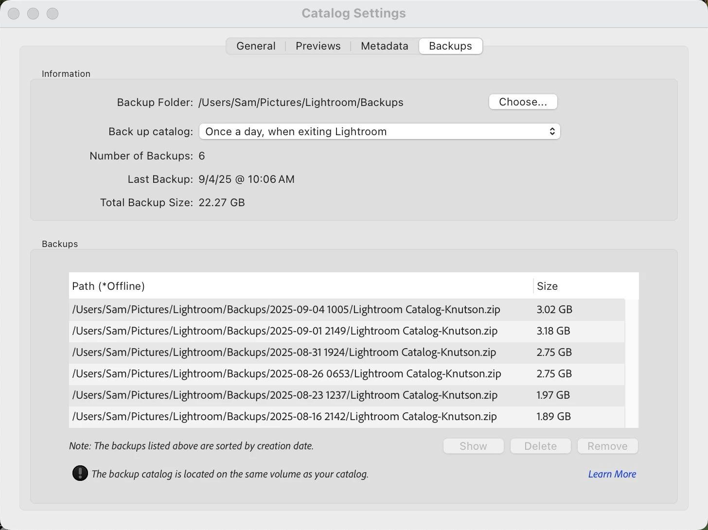 currently, it's quite easy for people to unknowingly have a folder of Lr catalog backups that's 100+GB, as Lr merrily creates and adds new backups based on one's setting.
