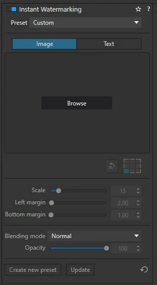 For example, while editing my images, I'd like to have the flexibility to choose a light or dark version of my watermark and the ability to place it at an achored location in my image (bottom left, top right, center, etc...). With that, having an additional feature to pad the location with XX number of pixels from left, right, bottom, top, etc... so its not exactly on the edge of the screen would be equaly useful. An exact example of this is how DXO PhotoLab (see attached image) does their watermarking. This Watermark feature can simply be an new panel on the right side and overlayed onto the image much like you do when adding a vignette from the Effects panel. It can be turned on or off as desired for the selected image.