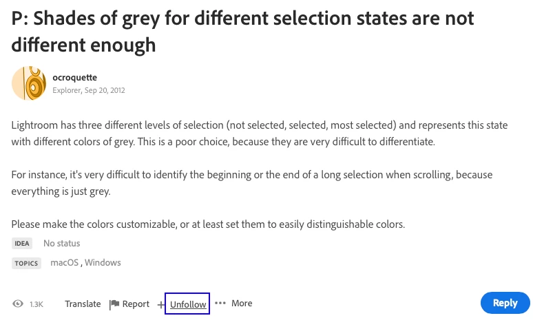 Lightroom has three different levels of selection (not selected, selected, most selected) and represents this state with different colors of grey. This is a poor choice, because they are very difficult to differentiate.