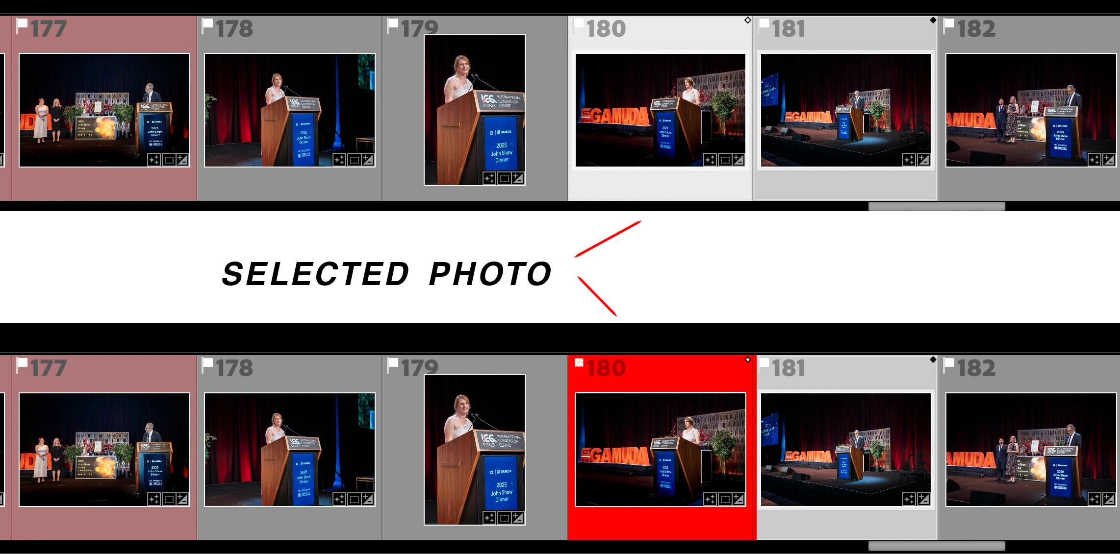 Sometimes I am culling a burst of very similar images and it drives me crazy trying to navigate the film strip, trying to know which image I have selected. Looking at the top line in the screenshot below. Can you easily tell which one is the "most selected" image? Maybe, yes in this one example, I suppose you can, but could it be easier? Could it be made MORE OBVIOUS so that I do not have to strain my eyes to see it? Yes, yes it could!