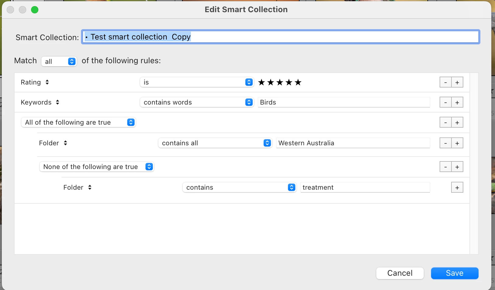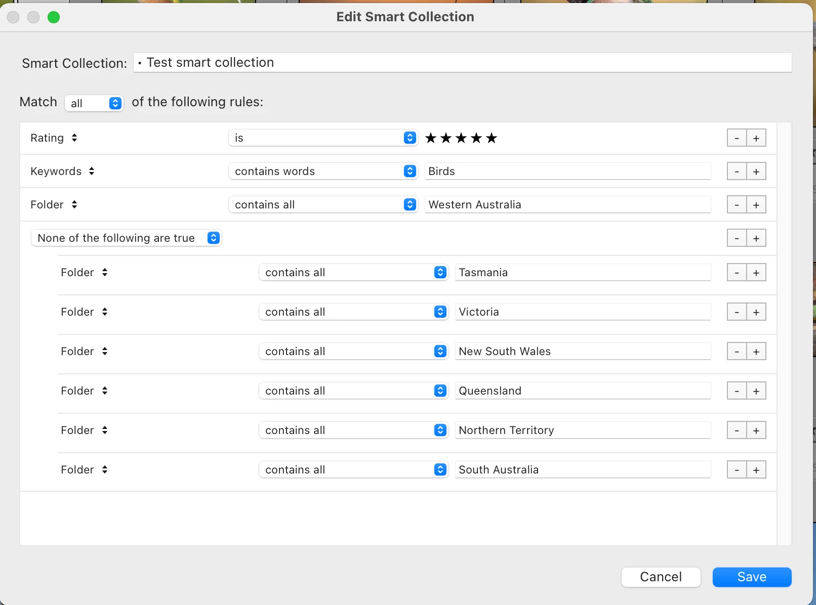 Currently (as in the sample smart collection rules below) I configure Folder 'contains all' Western Australia', then I need to exclude other states to ensure no other images from folders outside Western Australia are included. They are because they are located as a sub-folder of Australia ... and images are included from those other states if there happens to be a sub-folder that contains the word Western within it. Another example... Australia/Tasmania/Western Tasmania - and of course there are many others too.