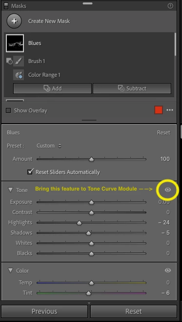 Being able to preview each curve/channel individually will bring immense benefits when tweaking the input/output values. Thus, users would have the ability to pinpoint and isolate how certain curves/channels are influencing the entire look of the photo. This would help photographers on all levels as beginners and experts can experiment while knowing the "why" and "how". In addition, the preview would make this module feel more approachable and less like a guessing game for photographers trying to enhance their images. Sectioning out the Masking Module helps photographers decipher which adjustments complement the image and vice-versa, so how about we bring that logic to the Tone Curve?