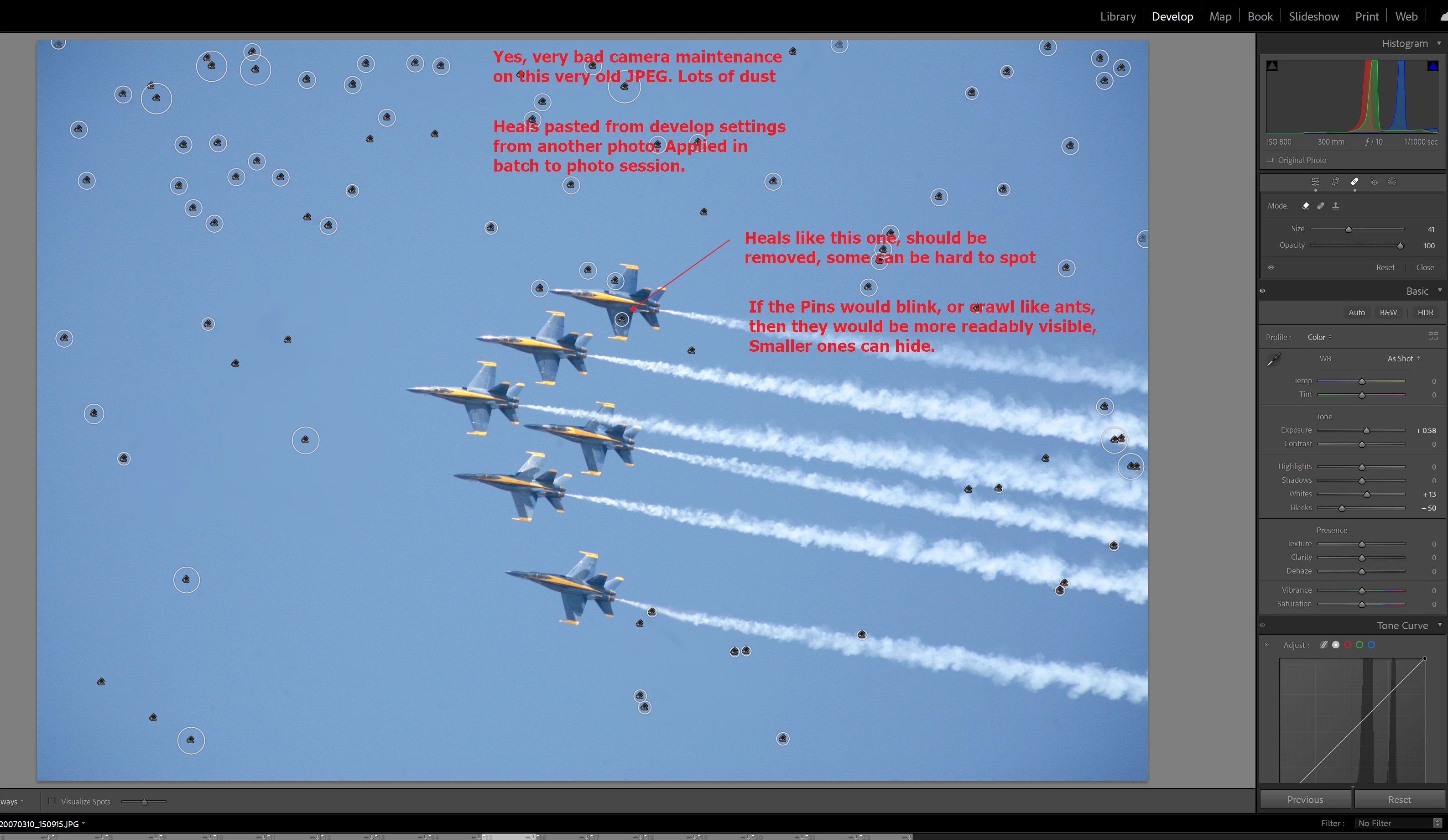 An example would be a set of Air Show photographs, where, unfortunately, your sensor had lots of spots. You might edit one image for all the possible heals. Copy that into Develop Settings, then batch paste that into the remaining photos. But some of those heals will wind up on the aircraft, and will need to be removed.