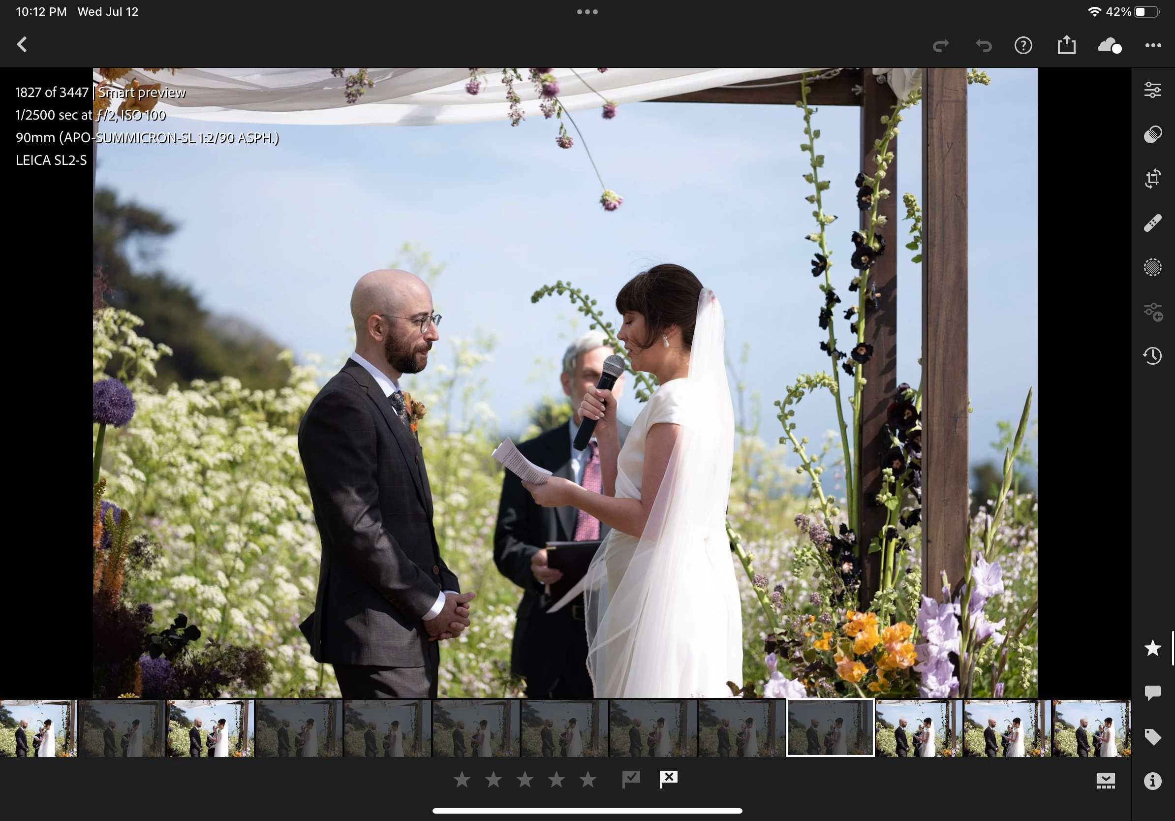I use LR extensively for culling. The iPad form factor + Apple Pencil make it really great as a culling device for my workflow. Sometimes though the viewable area when in the normal view makes the image a bit too small on the 11" iPad. If it were possible to have just a subtle flag/rating indicator in the corner of a photo when in full screen, when in the rating mode, that would be SO helpful and enable me to stay in the full screen view during the culling session. Here's an example of what I'm talking about. First photo is the normal view in the rating mode as it is. Second photo is what I propose it looks like when in full screen mode.