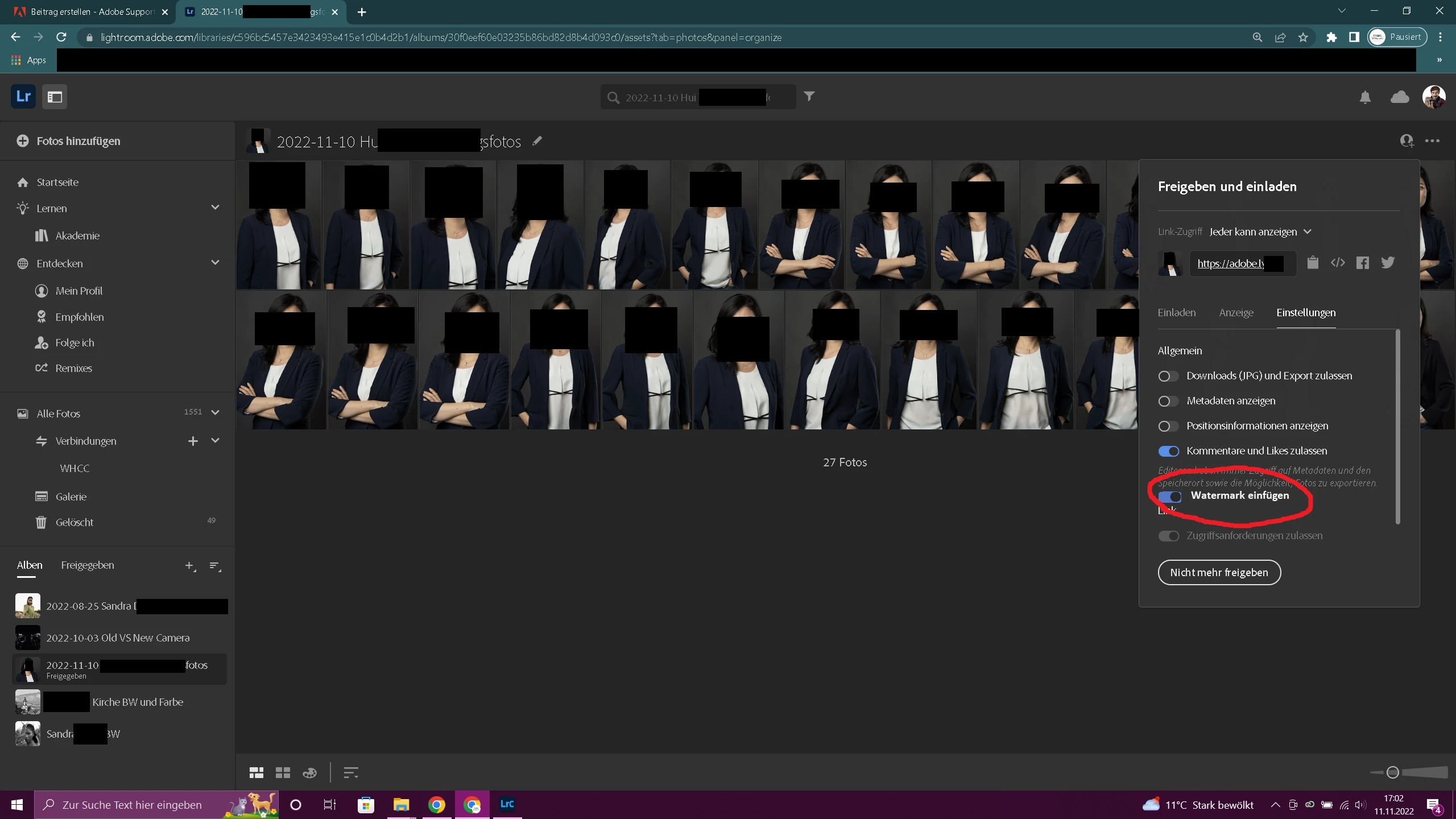 Ability to add a watermark to Shared & Invite albums via Adobe Lightroom app and desktop version. This is a great and easy way to send proof albums to clients to pick favorites and add comments with a Watermark.