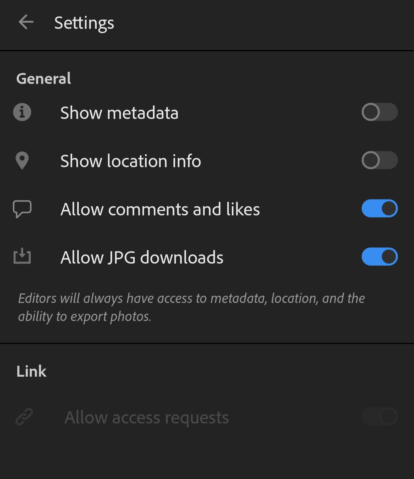 The share & invite feature on web ,mobile and cc creates a link that you can share to clients, you can enable to option to allow jpeg downloads, however there is no option to enable watermark on those downloads, I'm trying to make my work flow easier.