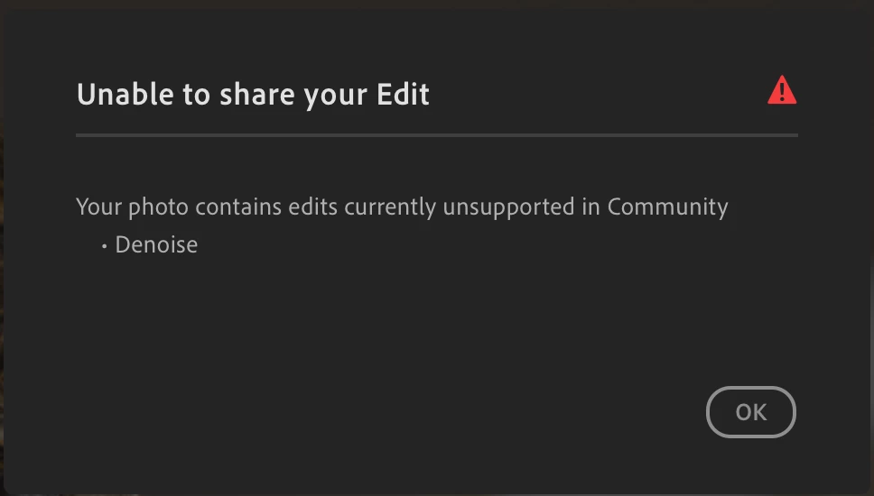 I have been using the new Adobe Denoise feature introduced in the last update. I really like it because it does not create a separate file. However recently I tried to post a picture to the community option in Lightrom Cloud and I get the message: