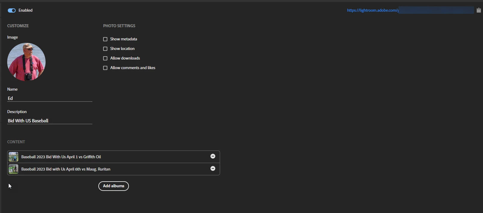 The problem is when wanting to do the same thing this year I realized the gallery link is not unique. In other words it remains the same whenever you enable a shared gallery. Sure, I can change out the albums but anyone who had the link from the previous year would see this year’s pictures. While in the context of Little League it’s probably not a big deal but I could see other applications where this would not be good.