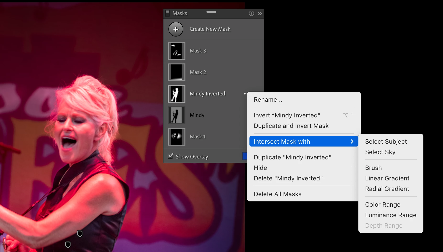 2- In the masks submenu where it has the "Intersect Mask With" feature It should display the masks that you have created as selectable masks along with the standard Sky-Subject-Brush etc. This would let you work o detaileded or intricate hand created masks.