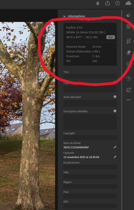 In the “Information” panel, the data at the top is not readable. It appears in grey text, and it should be white to make it easier to read. This concerns the camera model, lens, dimensions, and EXIF information.