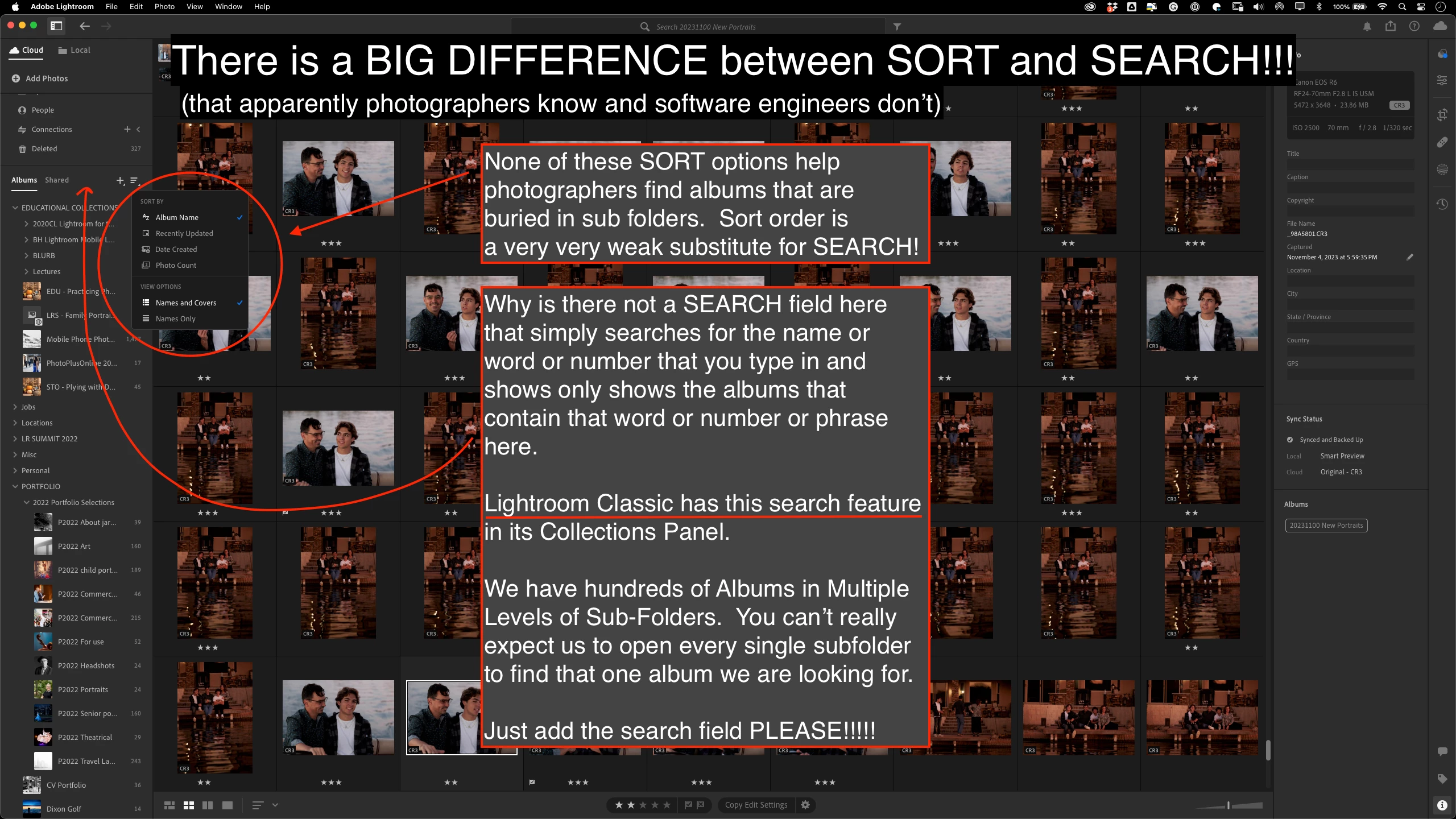Many of us have hundreds of albums and if you are organized, you also have a ton of folders and subfolders. But can you remember exactly which folder the album is in? Sorting by name or date doesn't help find them because they are buried in a subfolder. In Lightroom Classic, the Collection Panel has a SEARCH BAR at the top. When you type in a word, it reveals all of the Collections (albums) that contain that word. WHY ON EARTH in the NEW STREAMLINED MODERN LIGHTROOM is there no search field to find albums?