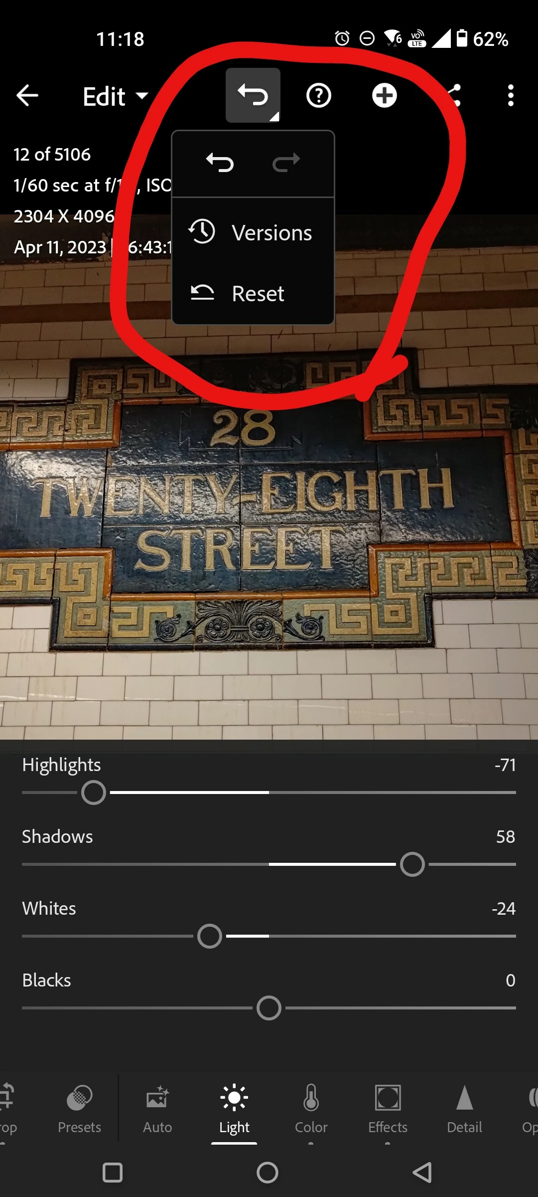 Lr Android 8.3.1 introduced a new drop-down menu for undo, redo, versions, and reset. With this change comes the addition of an extra tap to undo - first you have to drop down the menu, then tap the undo. To me, this was particularly jarring because the menu's icon changes to "Undo" when you perform an action that can be undone, but tapping it doesn't actually undo anymore.