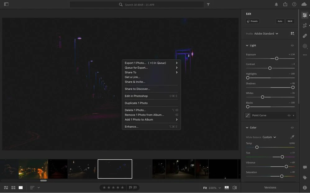 Duplicating the image to save copies of each picture variation isn’t too important as when I’m happy with it I export it anyway. And having multiple versions of the same picture on Lightroom can take up unnecessary screen and storage space (if I have an album with 100 pictures in and I try 5 variations for each picture by duplicating the image, there are now 500 images). Therefore I think the ability to queue pictures for export, simply remembering the adjustments made to the picture selected, would greatly help workflow and productivity.