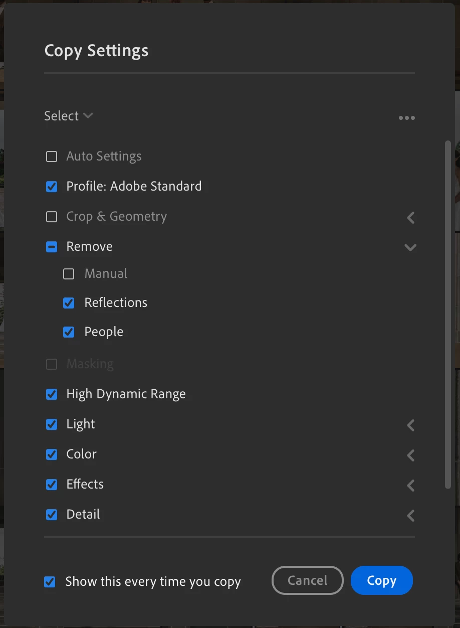 I imagine the Filter options expanding to include many specific functions, relatively simliar to those we are able to choose when Copying Edits on an image. Here's that Copy Edits options menu -- imagine if when you wanted to Filter large batches of images, a similiar set of options appeared: