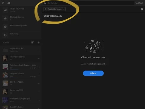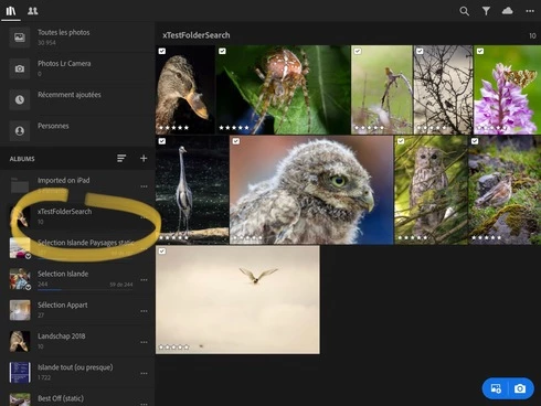Strange bug on iPad: the search functions totally ignores the folder names. Here are two screenshots illustrating the bug:An album called xTestFolderSearch containing 10 pictures: